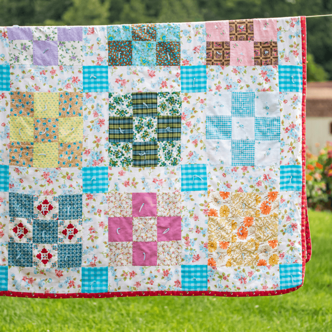 👉 Muster und Stoffe auswählen: Wähle ein einfaches Muster, wie das klassische Nine-Patch oder ein Streifenmuster. Bei der Stoffwahl sind Baumwollstoffe ideal – leicht, stabil und in vielen Farben und Mustern erhältlich. Ein kleines Stoffpaket (z.B. Fat Quarter) gibt dir eine bunte Basis zum Loslegen.