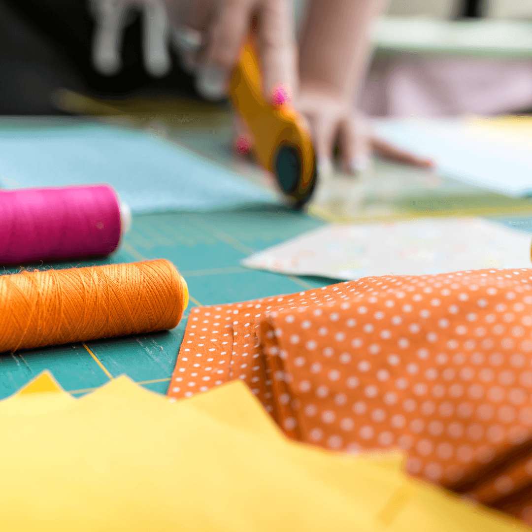 Rollschneider und Schneidematte: Der Rollschneider hilft dir, die Stoffe akkurat und schnell zu schneiden – und die Schneidematte ist dein Retter für den Tisch und für eine exakte Ausrichtung.