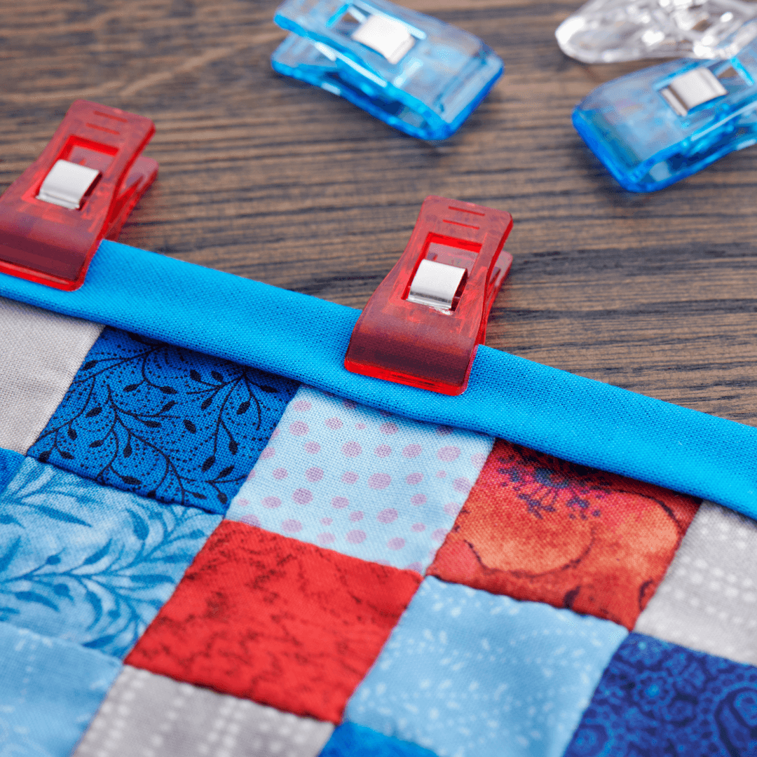 👉 Quilt-Sandwich legen: Lege die Oberseite, die Wattierung und die Rückseite übereinander. Fixiere sie am besten mit Stecknadeln, Stoffklammern oder einem Sprühkleber für Stoffe – und dein „Quilt-Sandwich“ ist bereit für die Nähmaschine. Lasse dir hier Zeit und hole dir bei grossen Projekten am besten weitere Hände um alles schon aufeinander zu legen.